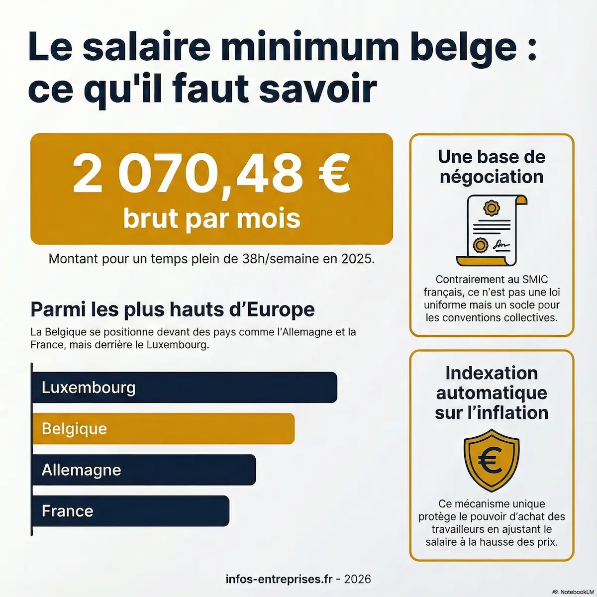 La Belgique dispose d’un système unique en Europe : l’indexation automatique des salaires. Lorsque l’indice des prix à la consommation (indice-pivot) dépasse un certain seuil, les salaires sont automatiquement revalorisés. En décembre 2025, ce seuil a été franchi, entraînant une indexation de 2 % appliquée dès le 1er janvier 2026. Le RMMMG est ainsi passé de 2 111,89 € fin 2025 à 2 154,11 € au 1er janvier 2026 (source : SPF Emploi).